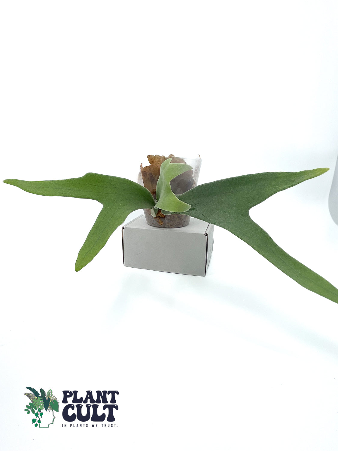 This medium-sized staghorn appreciates the usual bright, indirect light and humidity. Treat it as a typical epiphyte – mount it, water it regularly, and watch it thrive. Over time, its shields will form an overlapping nest and its antlers will grow upright with gently lobed edges, each frond featuring unique variegation patterns.