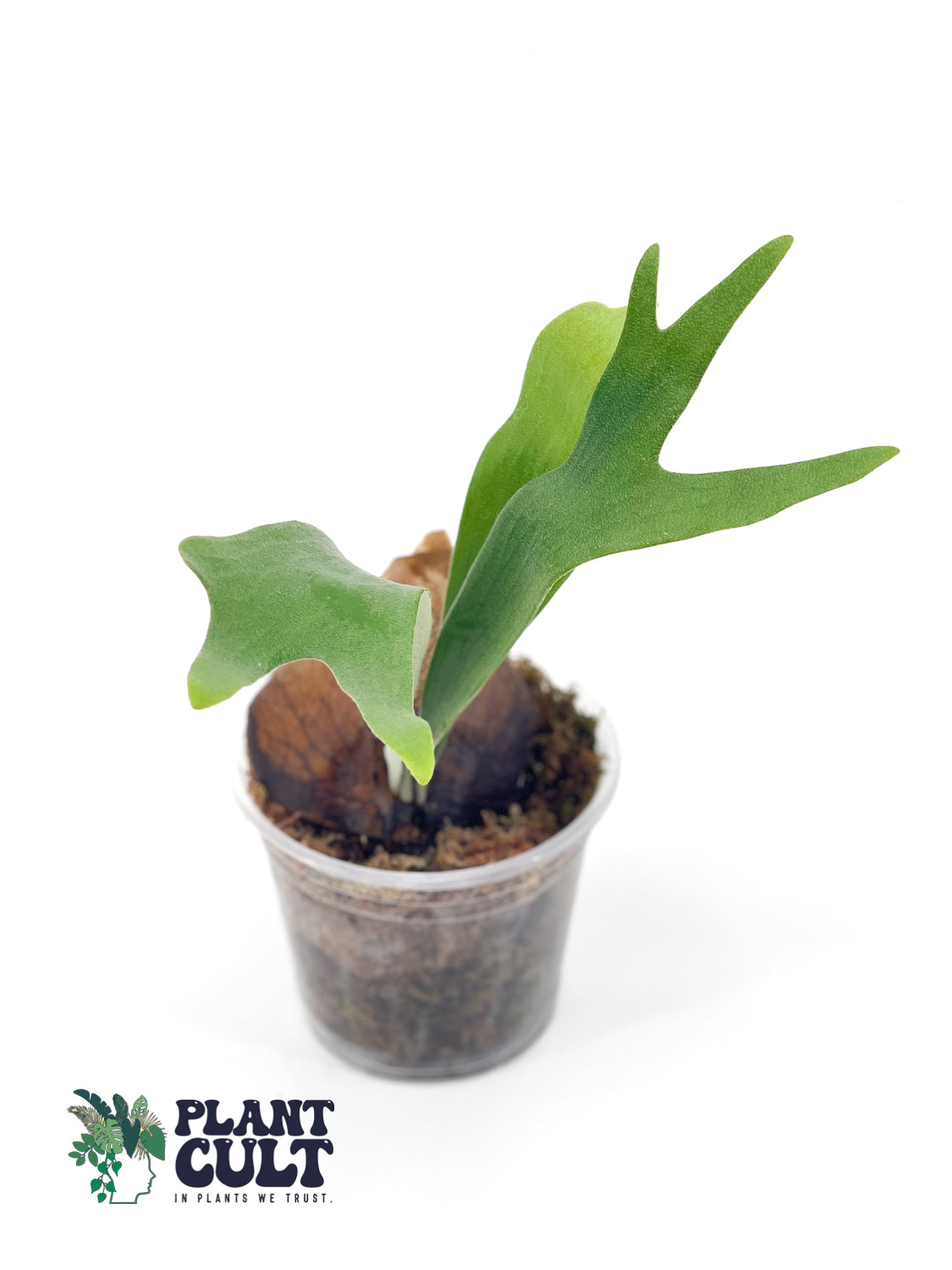 A rare highlight for any Platycerium collection. The HIPS x Bogor White sporeling is an uncommon hybrid that blends two striking varieties. Its fronds start out bright chartreuse green, quickly splashed with bold white patches that become more defined with age. Bogor White is a cultivar of Platycerium Willinickii. These sporelings have been nurtured from spore to small plants under our care, and are acclimated in well-draining bark mix.